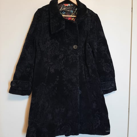 Kauniisti kuvioitu kevyesti topattu takki, jossa mustaa harmaata ja hohtavaa hopeaa kuviota. Desigual by Christian Lacroix. Kaksirivinapitus, sivuilla taskut, saa napitettua ylös kaulaan asti, lantiolle asettuva malli.
