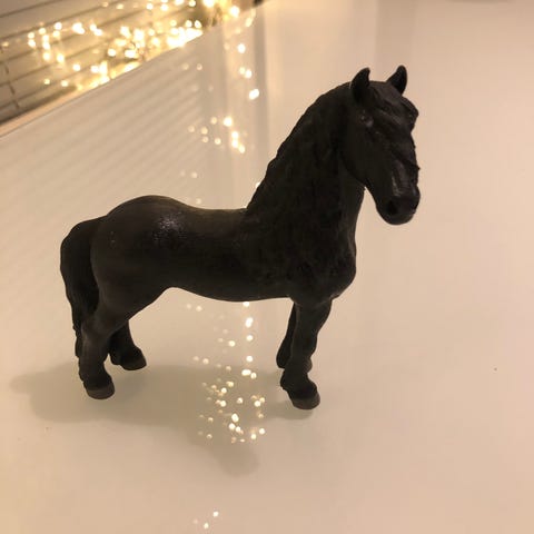Musta Schleich hevonen ja sen varusteet.