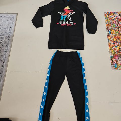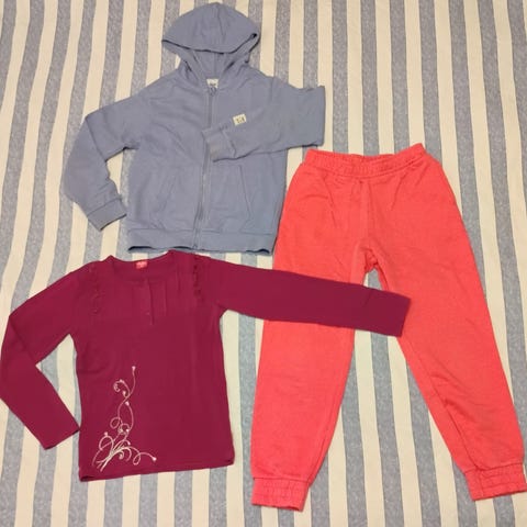 Tyttöjen Hupparimekko, koko 140, violetti väri. Vihreät cargohousut koko 140.