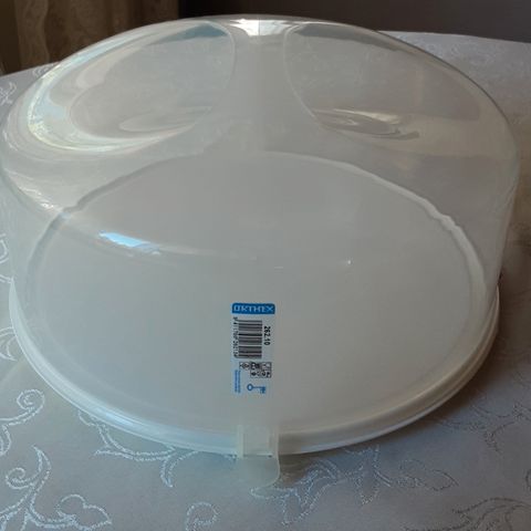Myytävänä Orthex kakkukupu. Kirkas kupu ja valkoinen alusta.