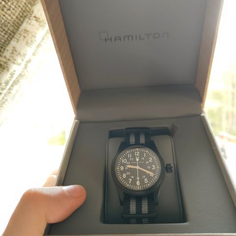 Myydään Espanjasta tilattu 2023 Hamilton Khaki Field automaattikello. Ollut välillä jokapäiväisessä käytössä, mutta eri nahkarannekkeella, joten alkuperäinen ranneke hyvässä kunnossa, aivan minimaalisia käytön jälkiä saa tutkia ennen ostoa. Koneisto on toiminut moitteetomasti. Referenssi nro: H7055533. Alkuperäiset paperit ja säilytyslaatikko.
