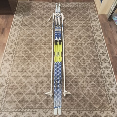 Joutavana seuraavalle hiihtäjälle perinteisen tyylin sukset, mukaan tulee sauvat 150cm. Hiihtokenkiä ei settiin löytynyt. Toinen sompa hieman rikkonainen, kts. kuva.