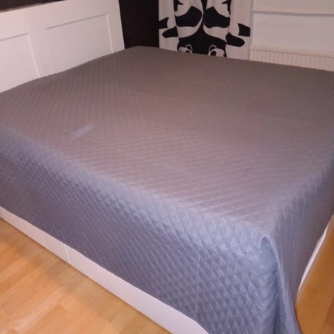 Kotikullan harmaa parisängyn päiväpeitto. Päälipuoli tummemman harmaa kuin nurjapuoli. Pari kertaa käytetty. Koko suunnilleen 260x260cm, tarkkoja mittoja en tiedä.