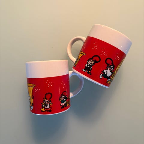 Pienet sydänkoristeiset glögimukit, 4 kpl. Vetoisuus 0,75 dl. Korkeus 7 cm ja halkaisja 4,5 cm. Erinomainen kunto.