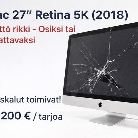Myyn erittäin hyväkuntoisen 27-tuumaisen iMacin Retina 5K -näytöllä. Laite toimii moitteettomasti ja on pidetty huolella. Mukaan tulee alkuperäinen näppäimistö, hiiri sekä alkuperäinen pakkauslaatikko.