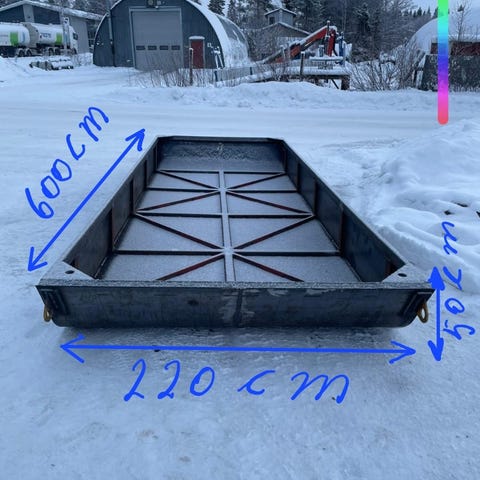 Omamassa 260 kg. Pituus 3000 mm, leveys 1650 mm ja korkeus 1400 mm.