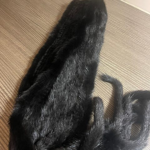 Mustanruskea minkkiä oleva turkis kaulaliina. Pituus 149cm ja leveys 13cm.