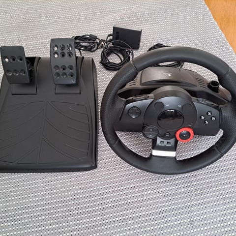 Logitech Wingman Momo Force ohjauspyörä ja polkimet pelikäyttöön. Ohjauspyörässä useita toimintonäppäimiä ja polkimet sisältävät kaasun ja jarrun. Liitännät johdoilla. Väri punainen, musta ja hopea. Sopii simulaattori- ja ajopelikäyttöön.