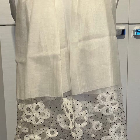 Kaksipuolinen huivi. Leveys 30, pituus n. 160cm.