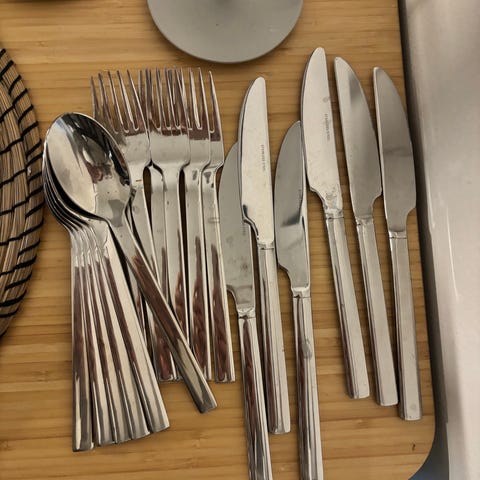 IKEA aterimet setti, valmistettu ruostumattomasta teräksestä. Sisältää erilaisia aterimia, kuten veitsiä, haarukoita ja lusikoita.