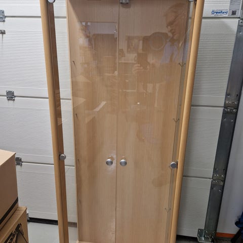 Lasivitriini ja kaapistot hyllytasoilla. Yhden moduulin leveys 77cm. Materiaali: pyökki. Toimitus lähiseudulle sis. hintaan.