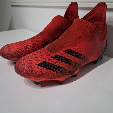Adidas Predator jalkapallokengät mustalla ja punaisella värityksellä. Kengät ovat koko 40 ja niissä on kumipohja, joka tarjoaa hyvän pidon nurmikentällä pelaamiseen. Sopivat jalkapalloharrastukseen ja harjoitteluun.