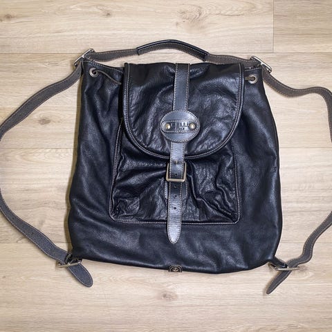 Vera Pelle nahkareppu, 27 x 22 x 10 cm. Viat kuvissa.