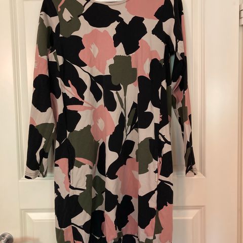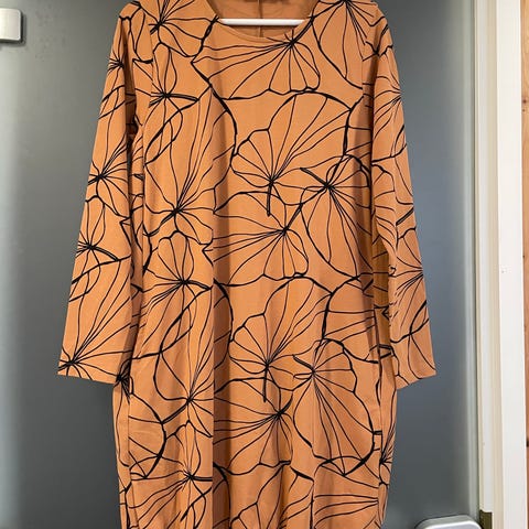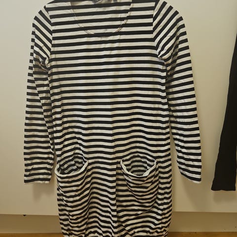 Ehkä paristi pidetty pisaratunika, jossa taskut sivusaumassa. Koko M. Tarkka voi huomata pienesti kankaalle ominaista pesuhaitua pinnassa. Kissakoti