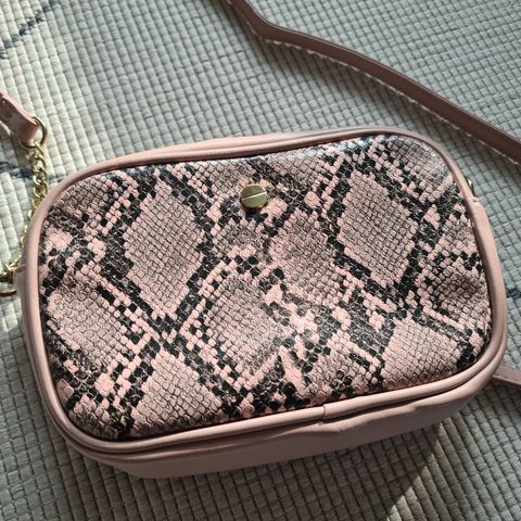 Kuvan uusi ja käyttämätön käärmeennahkakuosinen pinkki käsilaukku. Mitat: k: 19cm, l: 28cm, s: n. 7cm. Toisella sivulla ulkopuolella tasku, sisällä kaksi eri lokeroa (keskellä vetoketjutasku jakaa tilan), toiselle puolelle jää yksi vetoketjutasku lisää ja toiselle puolelle pari pientä taskua. Ihana kultainen olkainketju.