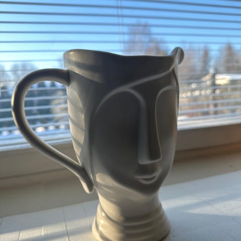 Tummanruskea kahvallinen maljakko/kannu, korkeus n. 23 cm, leveys pohjasta n. 8 cm, paksuimmasta kohdasta n. 12 cm ja ylhäältä n. 10 cm. Pohjassa nimikirjaimet TM. Voin lähettää tuotteen.