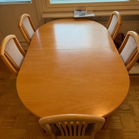 Myydään hyväkuntoinen vaaleakoivun sävyinen jatkettava ruokaryhmä. Pöytä erinomaisessa kunnossa mutta tuolien kankaissa pieniä tahroja (aina voi laittaa mieleisen kankaan tilalle). Pituus 170 ja leveys 100cm