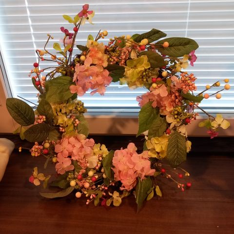 Ihana, herkkä, trendikäs sisustuselementti omaan kotiin tunnelmaa tuomaan tai lahjaksi. Kranssirengas on vaaleaa puuta, sidonnassa käytetty mm. Erilaisia eucalyptuksia, pampaheinää, syyshortensiaa, lunariaa, tuijaa ym. Somisteena lisäksi kevyttä nudebeigeä nauhaa.