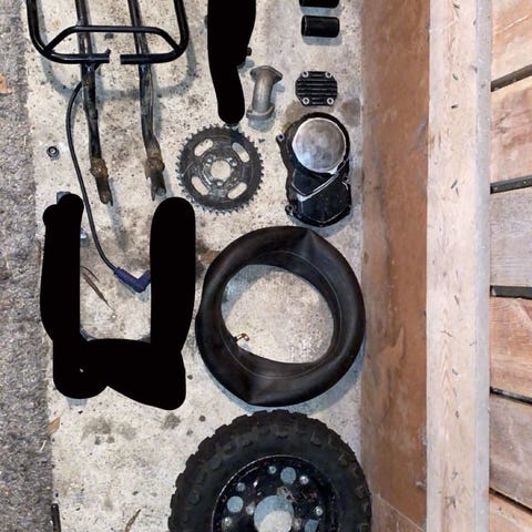 Monkeytype pohjalevy, kannen kansi, jalkatapit, vaihdeakselin Stefa 50-110cc ja imukaulan laippa. Halvalla lähtee kaikki