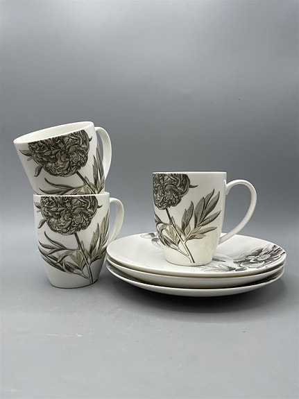 Arabia Lumikukka kahvikupit 12-osaa + 8. Design Raija Uosikkinen.Kuppi, tassi ja pullalautanen kaikkia 6kpl. + 3kpl tassi ja 5kpl pullalautanen.