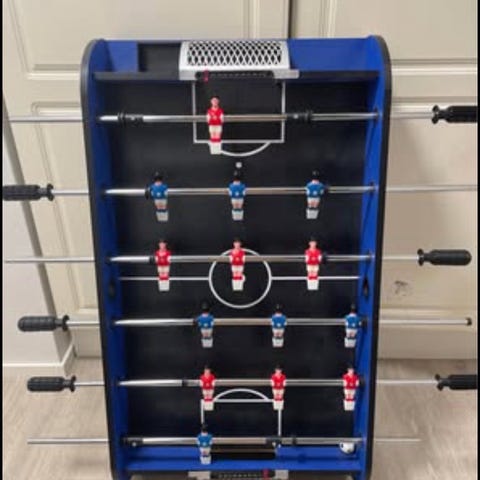 Jalkapallopeliä voi pelata myös sisätiloissa. Pallot ovat pehmeät halkaisija 9cm ja maalin koko leveys n.42cm ja korkeus n.24cm. Maali on patteritoiminen ja siinä on kannustusäänet sekä liikkuu sivusuunnassa.