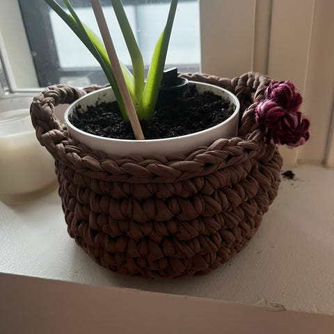 Uusi,Pauliina punos kuteesta virkattu kori. Korissa vaneri pohja. Halkaisija 26cm.
