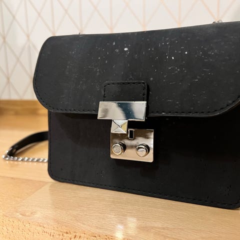 Musta laukku olkaketjulla, jonka saa kötevästi laukun sisälle. Laukun etu- ja takapuoli kovaa haitarimuovia, päädyt ja sisusta nahkaa