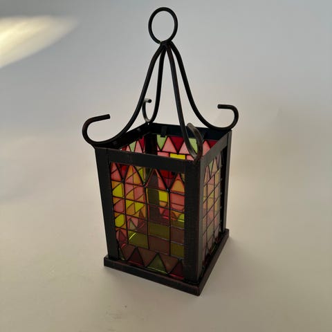Kynttilälyhtyyn voi laittaa alaosaan esim. koristekiviä kuten kuvassa. Kynttilälyhty on kaksiosainen ja keskellä jykevä metalliosa jossa on tuikku.