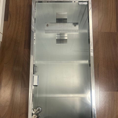 Hyväkuntoinen, teräksinen, lukittava lääkekaappi. Mukana kaksi avainta. Kiinnitys neljällä ruuvilla. Kolme hyllyä, joiden syvyys noin 10cm.