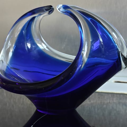 Hyväkuntoista taidelasia 1900-luvun puolivälistä. Kulho on valmistettu kirkkaasta ja sinisestä lasista. Ainoastaan vähäistä kulumaa, joka tuskin näkyy (lyhyitä hiusnaarmuja).