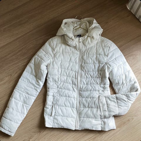 Tarpeettomana nuorelta jäänyt muotitakki / talvitakki / untuvatakki. Edessä vetoketju ja nepparit, taskut sivuilla, helmassa nyöri.