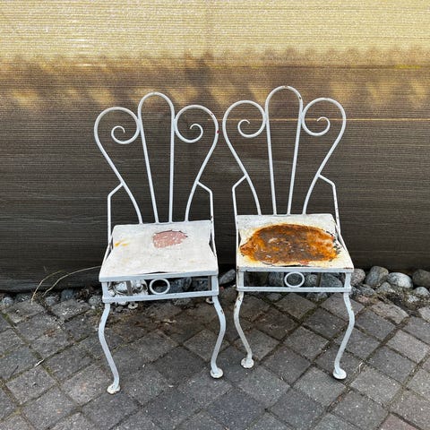 Metallinen tuoli, jossa valkoinen runko ja punainen pyöreä istuin. Istuinosa ehjä, Metallissa käyttö kulumaa. Tuolissa koristeellinen selkänoja ja jalat, jotka on valmistettu metallista. Soveltuu sisä- tai ulkokäyttöön. Myydään tarpeettomana.