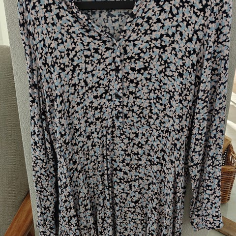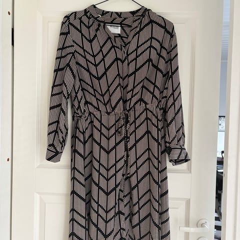 Selected Femme mekko, koko 36. Valekietaisu. Mekossa musta ja valkoinen kuviointi. Valmistettu kevyestä viskoosista. Pitkähihainen malli, midimitta.