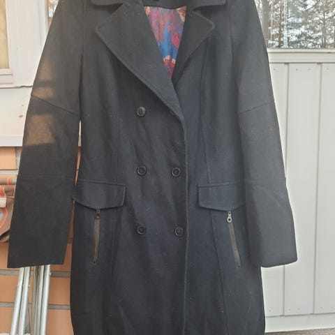 Musta pitkä villakangastakki, KappAhl koko 42, kai-kai mitta 56cm. Hyväkuntoinen.