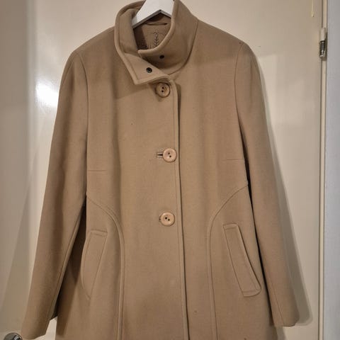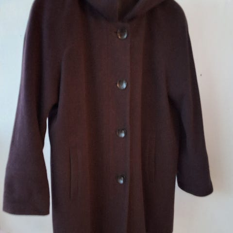 Tyttömäinen alaspäin levenevä villakangastakki jossa korkea ja muunneltava resorikaulus,ja resorit myös hihansuissa. Kevyesti olkatopattu. Tosi lämmin (60% villaa). Pituus 85cm, hiha olkapäästä 60cm ja rinnanympärys 114cm. Säilytyskurtussa,mutta muuten kunnossa. Väri tumman ruskea.