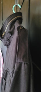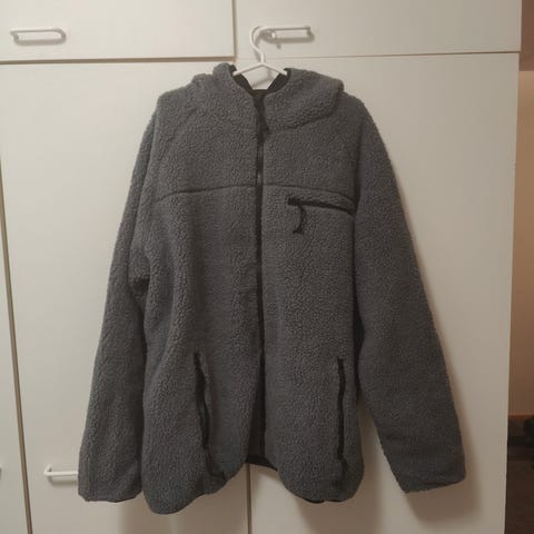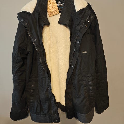 Valo vääristää/haalistaa takkia valokuvassa. Takki oikeasti tasaisen mustan värinen. Vain muutaman kerran käytetty, kun ei ollut enää oikean kokoinen.
