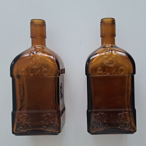 Pohjasta löytyy merkintä K2, joka tarkoittaa, että pullo on Kotkan Karhulan lasitehtaan tuotantoa. Alkon leijonawhiskey-pullot, joissa on korkkinen korkki ja pohjassa K2-leima, on valmistettu noin 1960-luvun alussa.