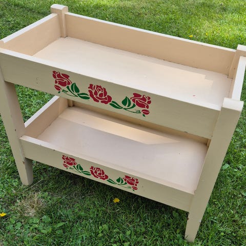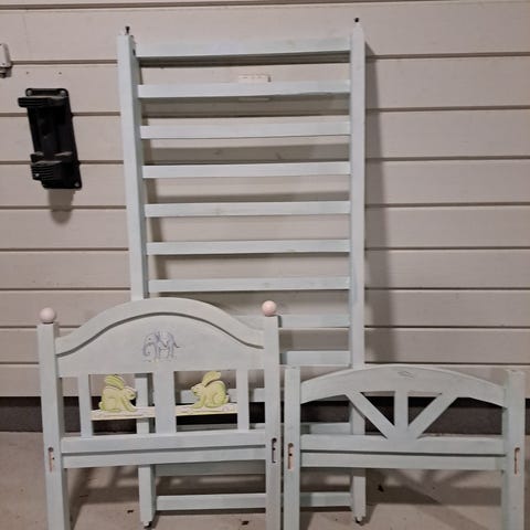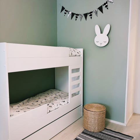 Lasten kerrossänky, koko 90x200cm. Tarroja on liimailtu, osa jo poistettu. Etu-Lehtikankaalla. Koiratalous.
