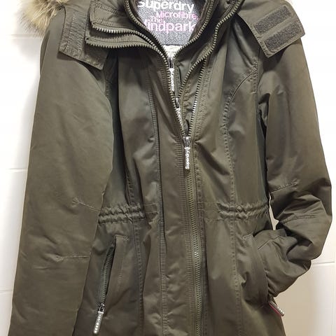 Hyvännäköinen rento takki sisältäen hupun. Edessä vetoketju taskut. Erinomainen kunto.