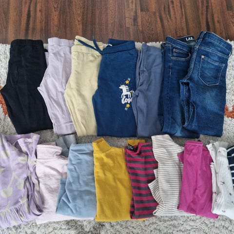 5 t-paitaa, 2 neuletta, 2 trikoopaitaa ja yhdet siistimmät housut