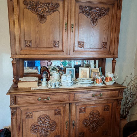 Puusepän tilaustyönä männystä valmistama korkea ja tilava kaappi peilillä.