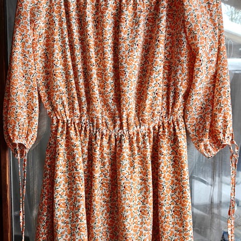 Ihanan rento oranssi maksimekko koko L/XL. Pirteä ja sopii kaiken kokoisille. Vyötäröllä kuminauha. Kaupan päälle vielä kynsilakka.