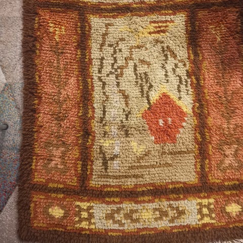 Vanha käsintehty ryijy, kaunis kuvio, ehjä ja siisti. Koko 140 x113 cm.
