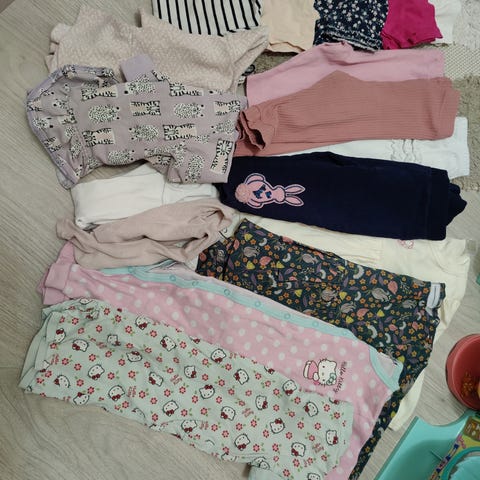 Vauvan vaatteet, koot 74 ja 80. Everest pipo mukana. Olohaalari, muumibody, pitkähihainen paita, housut, Pipsa possu yöpuku.