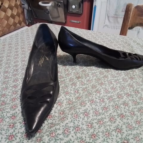 Uniikkia kenkämuotia vuosikymmenten takaa (ehkä 1960-luku). Koko 40, mielestäni paremminkin 39. Korko 5,5 cm. Materiaali: keinonahka ja tekstiilivuori. Tädin jäämistöstä huolella säilytetyt nuoruuden korkkarit nyt esille ja tuulettumaan - katseita kääntämään!! Eivät kaikkein ergonomisimmat mutta sitäkin näyttävämmät!