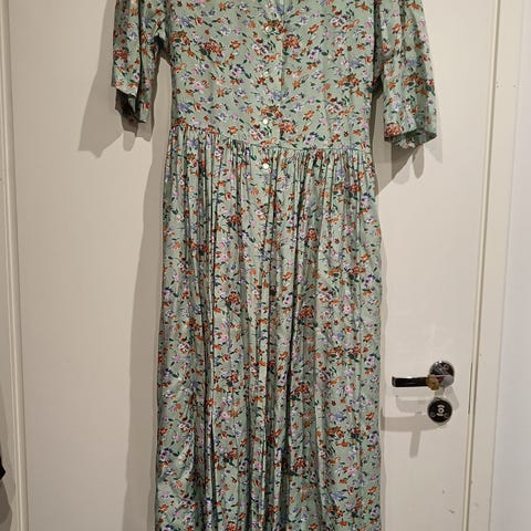 Sivuilla nauhat, joilla voi kiristää vyötäröä ja sitoa rusetin eteen tai taakse. Ei tarvitse silittää, ei mene ryppyyn. Ei lappuja tai brändiä.
