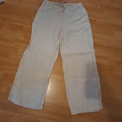 H&M Linen Blend housut naisille, koko XS. Väriltään valkoiset, valmistettu pellavasekoitteesta. Suorat lahkeet ja joustava vyötärö. Sopii kevyeen ja ilmavaan pukeutumiseen.