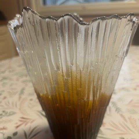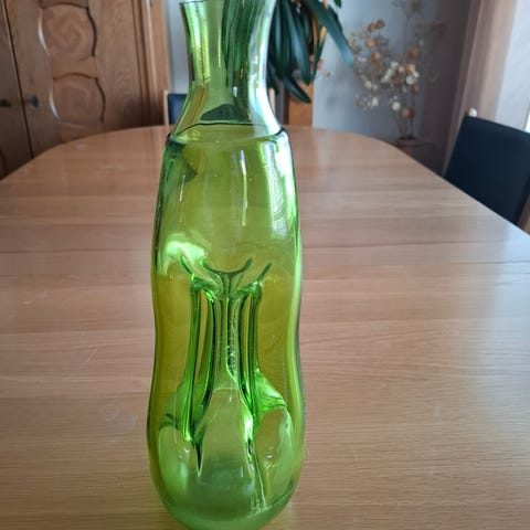 Maljakko valmistettu kirkkaasta lasista. Koristeena kaiverrettuja lehtikuvioita. Korkeus noin 30 cm. Sopii kukkien tai koriste-esineiden esillepanoon.