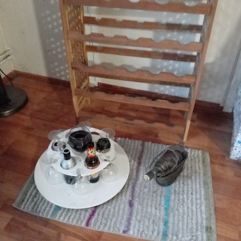 Viinitarvikkeet puurasiassa..Sisältää 2 viinilasia ja paikka viinipullolle. Käyttämätön