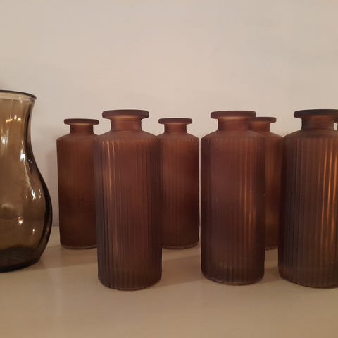 Kaksi ehyttä lasi pulloa / maljakkoa joista toinen on vaalean vihreä ja toinen harmaan violetti. Riippuu pikkasen minkälaisessa valossa katsoo. Pohjassa numerot 07 ja en tiedä mitä tarkoittaa